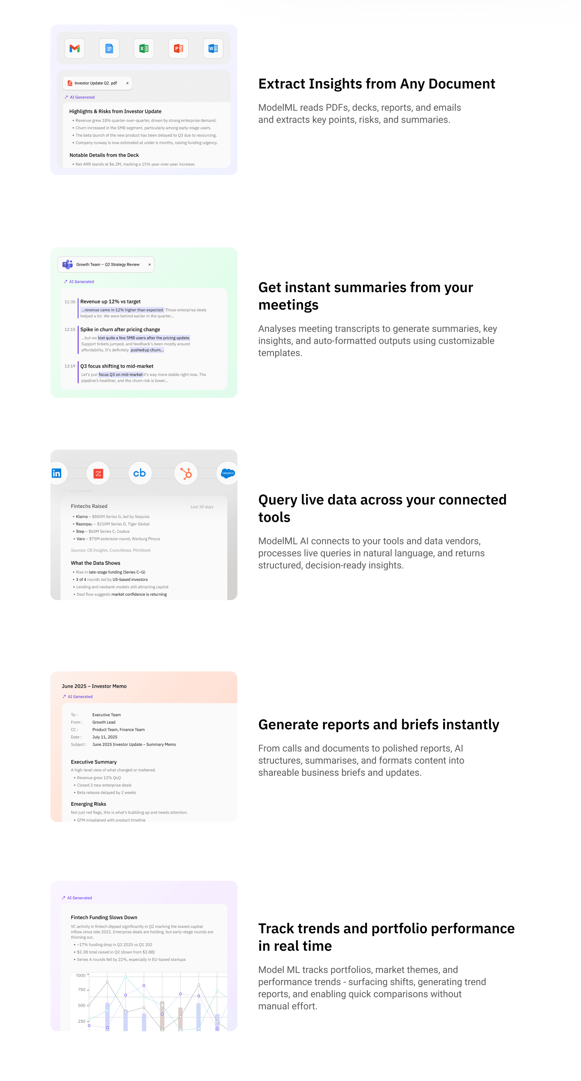 Model ML is an AI-powered platform that connects all data sources and applications, enabling seamless analysis, automated workflows, and efficient insights across multiple sources at once.